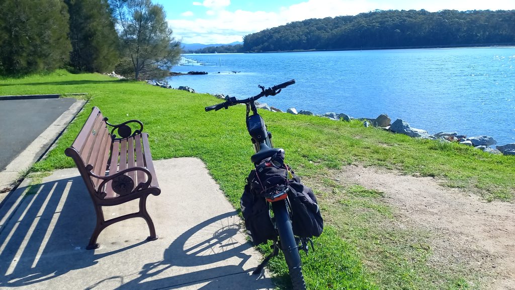 Fabulous ride. Been wanting to do this since getting the bike. Down the valley with Moruya River on the left (to the north) mostly on a path, stopping to take some photos of this spectacular but underrated countryside, with lunch at the boat ramp just downstream of the oyster beds.