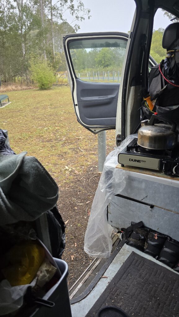 Well that was an ordeal. The van is chock-full with stuff everywhere and it’s impossible to catch the creature and let it back into the bush. It would have had to have been a trap and I breaded the thought. All very stressful, as this thing ran and rattled and crashed through the place.