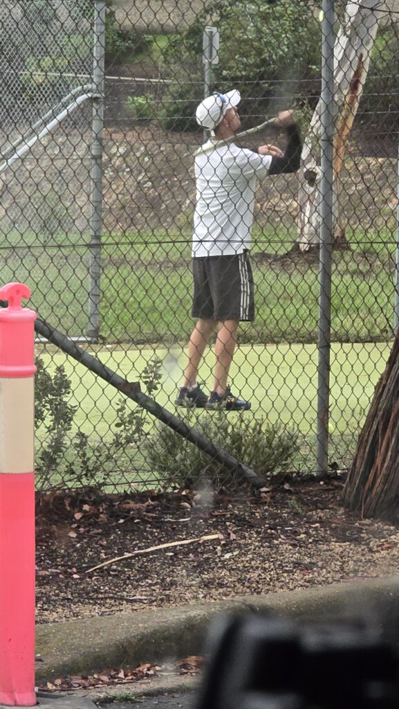 Can’t relax because action man arrived about 2 hours ago and hasn’t left. First into the tennis court then golf practise on the waterlogged oval, change shoes again and back onto the tennis court hitting shors against the return wall. Bit of a dickhead, this old bloke. Might be trying to prove something because I’m here. Looks a lot like a goose. Alone, little shitbox car, perhaps a local identity. Has to do sport. Is he waiting for someone? Hitting away. The noise is going to get to me.