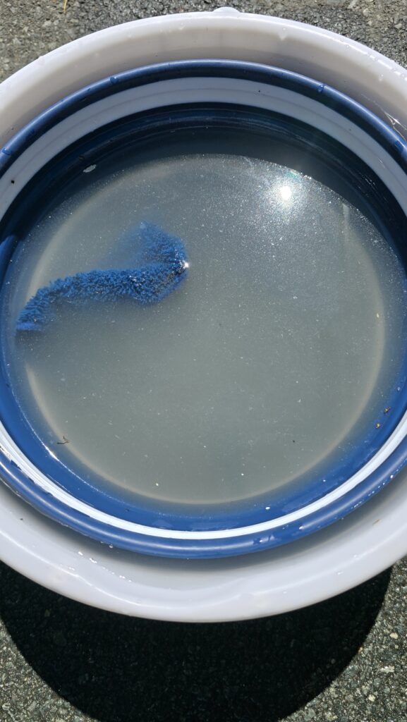 Took minutes and it feels like I’ve just started the adventure. Went to Moruya river sth side fish tables at Riverside Park and scrubbed quickly the outside, getting wd40 off, and grime, then did the inside for possibly the second time ever.