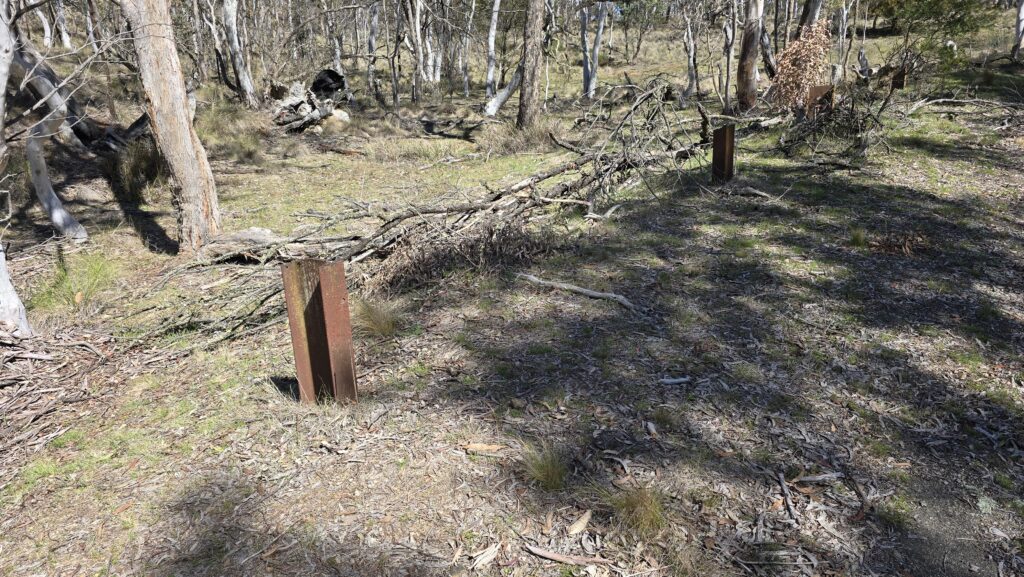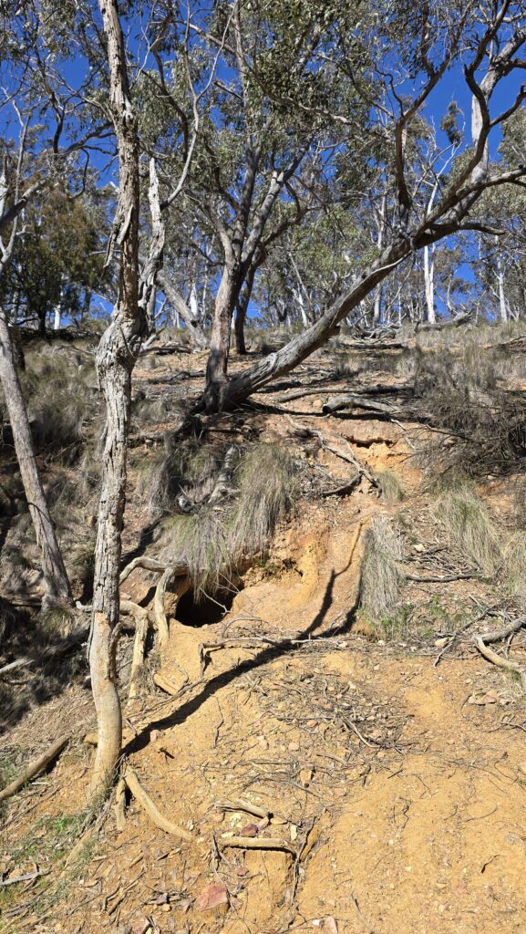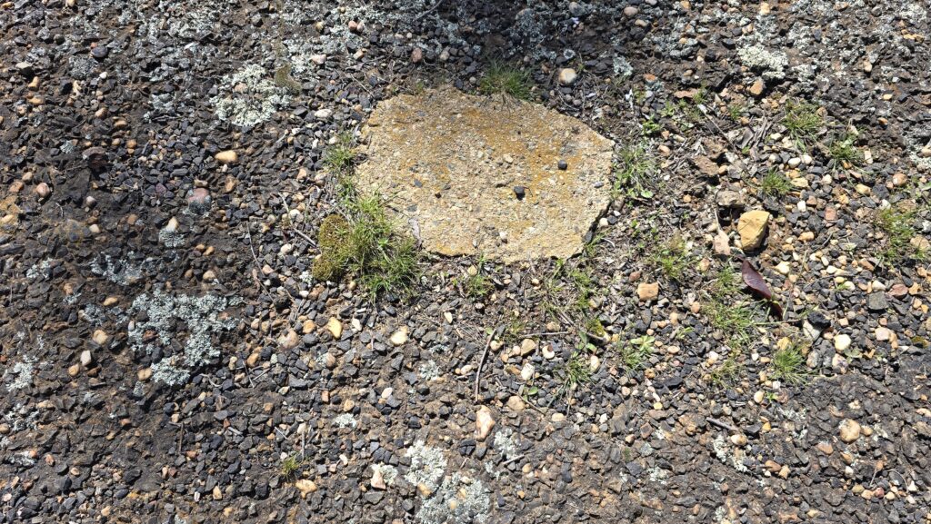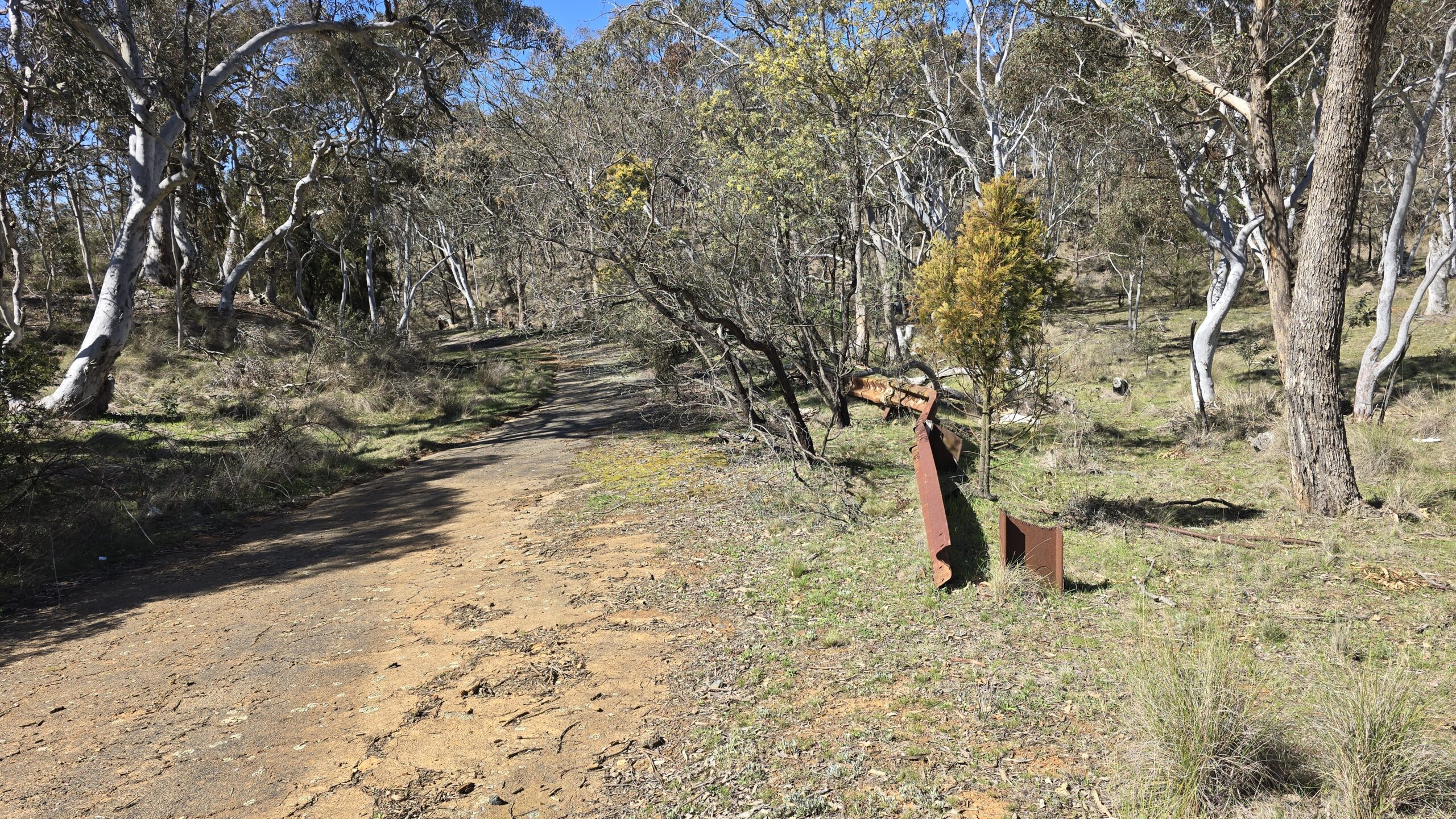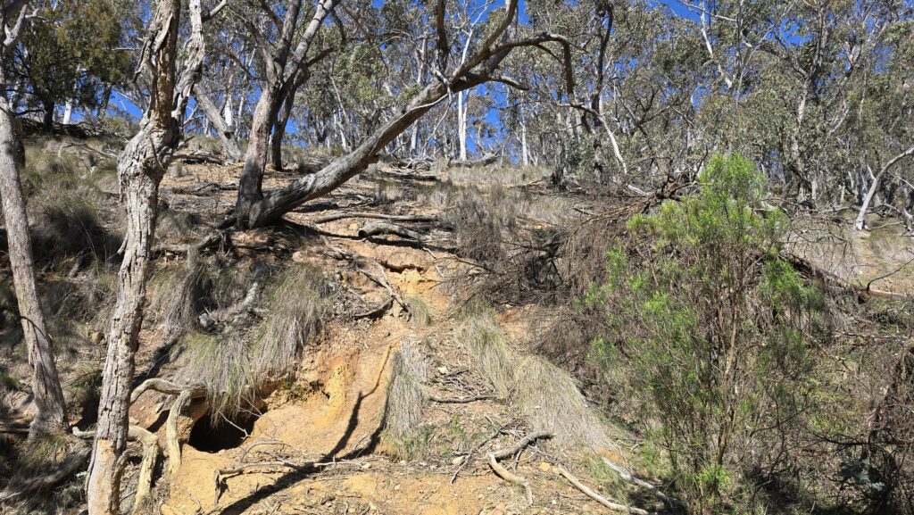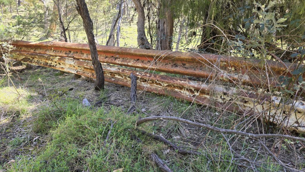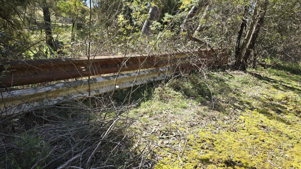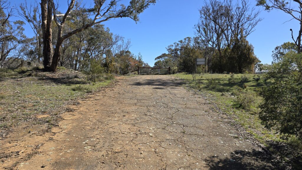 On the bottom left (mobile view) is the top of the hill and border. Also wombat hole, old rusted guard rails, and bitumen and concrete track having grown lichen.