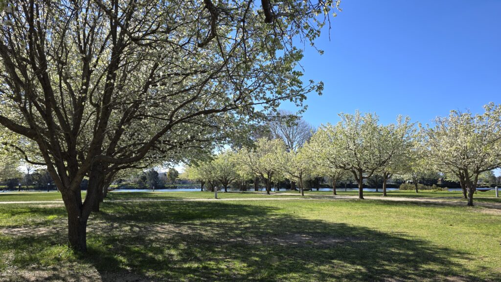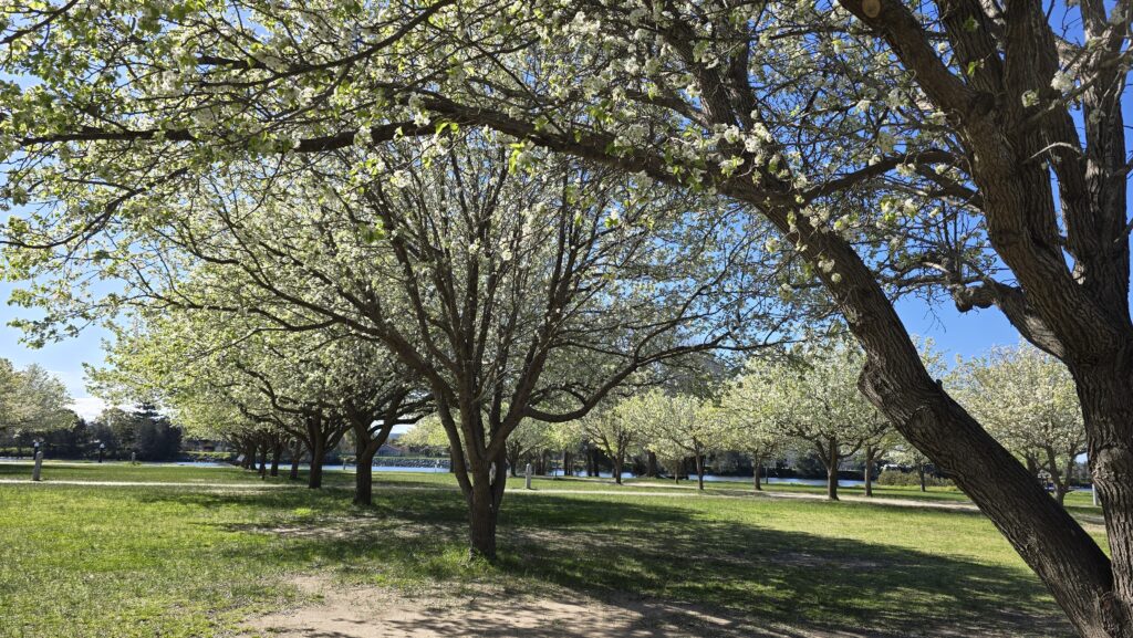 Riverside Park blossoms launching with Spring. These trees since I’ve been van living and visiting on them have gone from flame colours to soft whites. What a privilege to experience them.