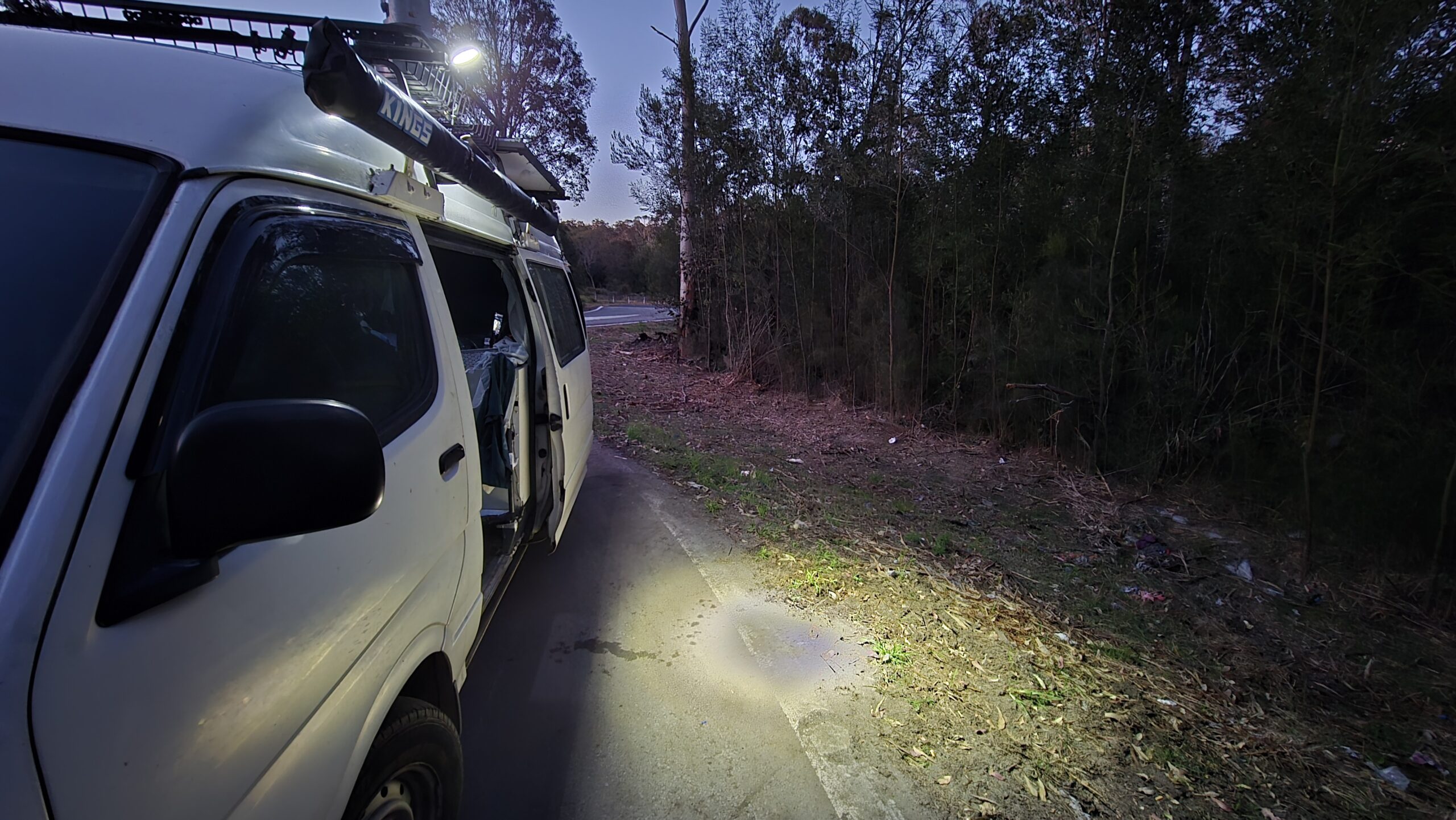 Hard to get going today. Quick early stop at the quarry for oats, get hassled by a Bodalla redneck, and shower beside the quieted road. Painting at Moruya. Cleaned the van rollers, at the rest area away from the creep.