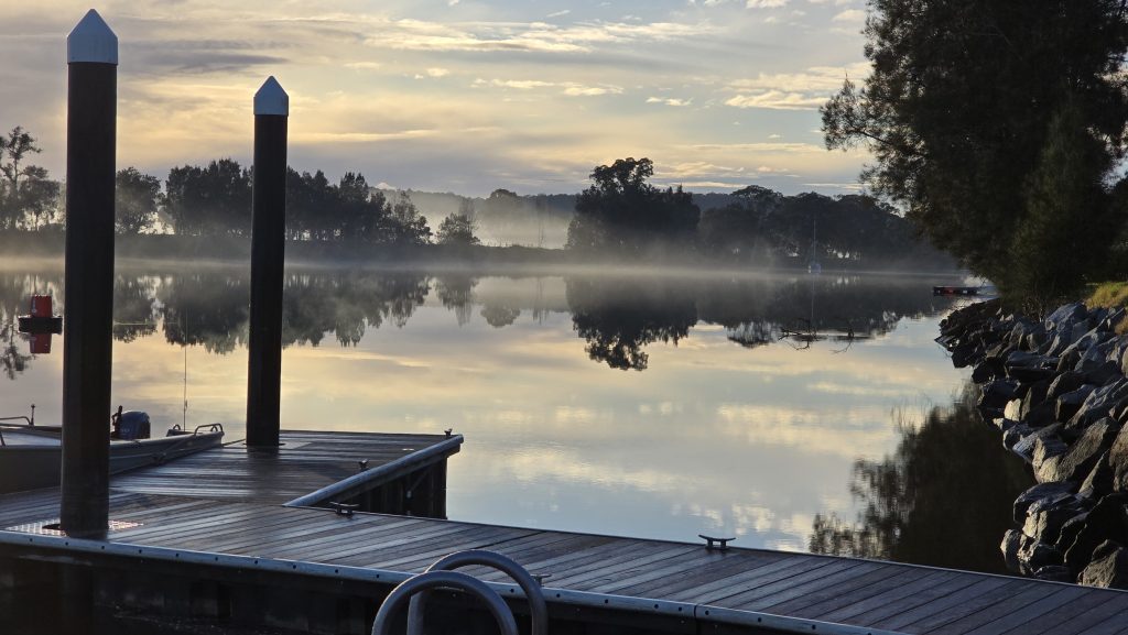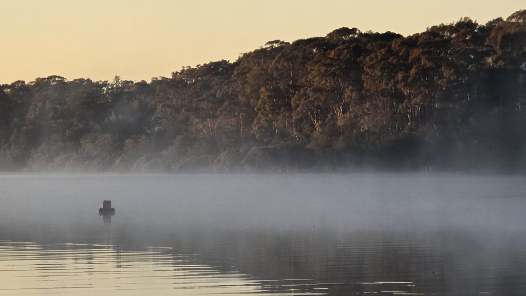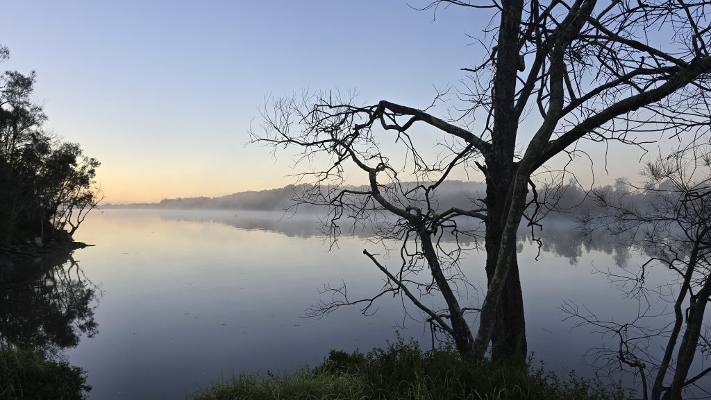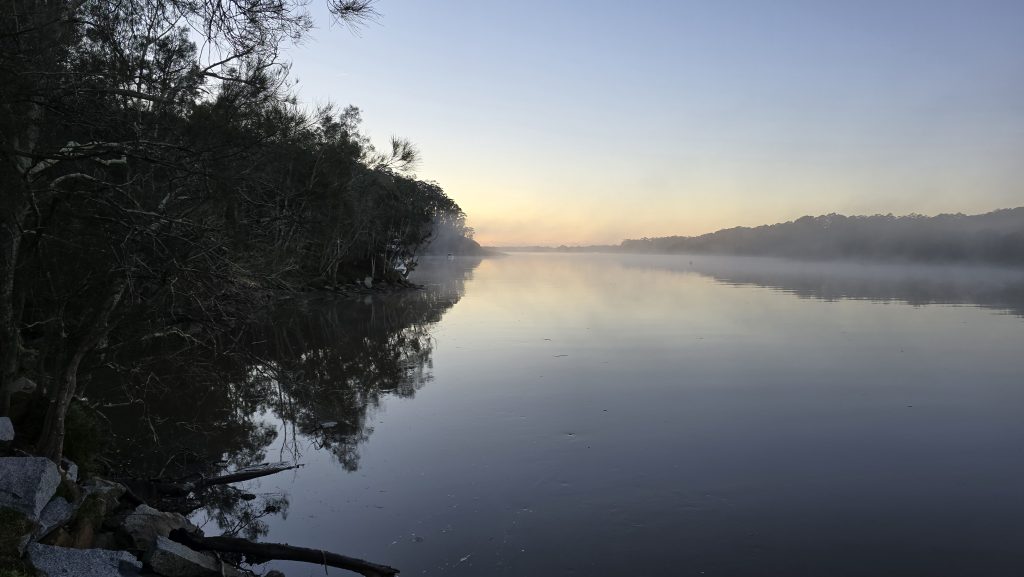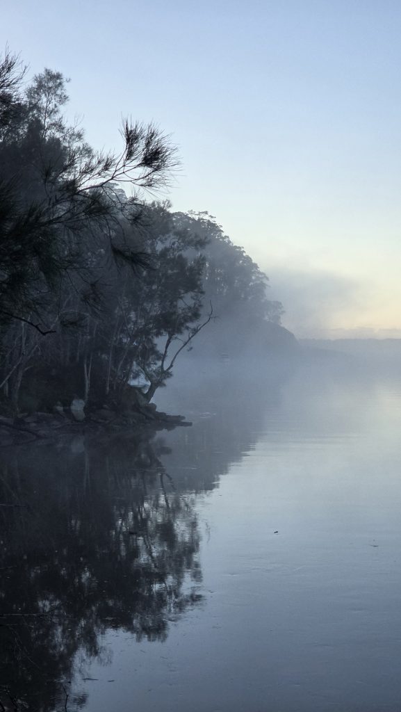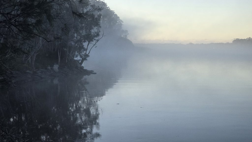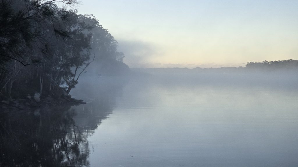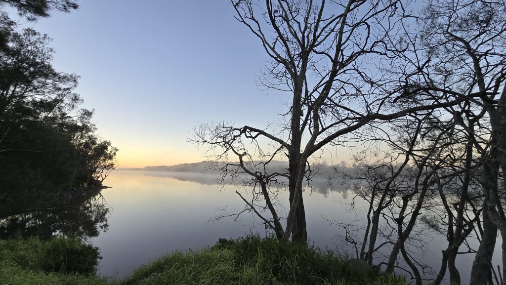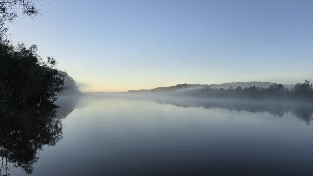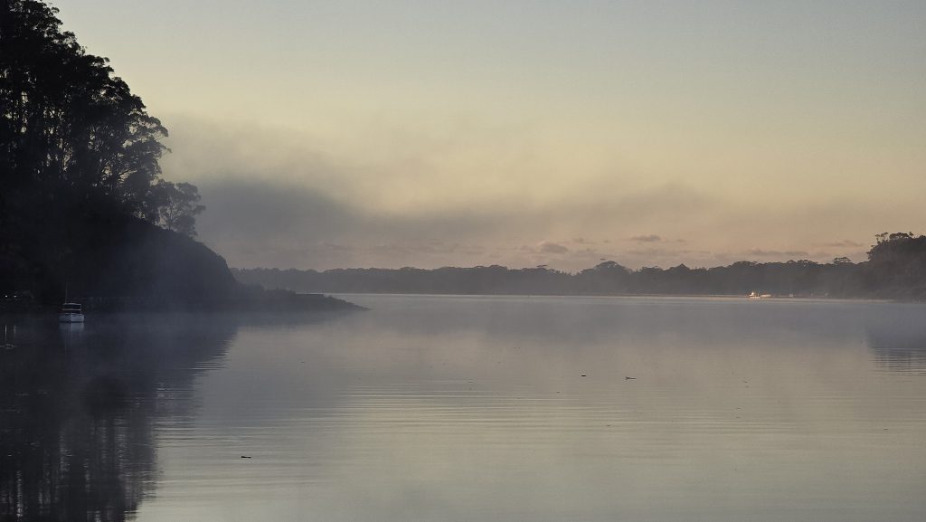 Earlier. A ritual has developed. Rip into a coffee in the dark, very early (around 4AM). An outright pleasure. While reading and commenting at The New York Times. With darkness barely nudged aside so I can see sufficiently to walk around the car and not hit it, pack up. Warming the engine all the while. Drive to Moruya. And get blown away along the valley flat, and then again at the river: