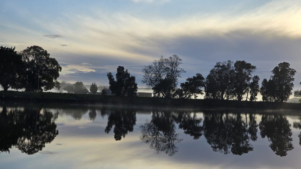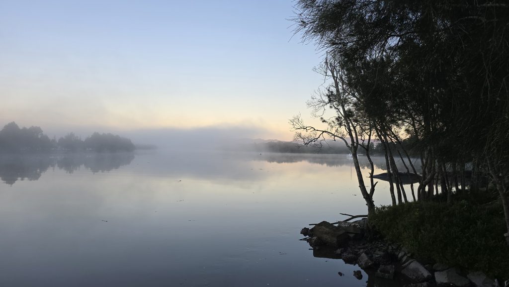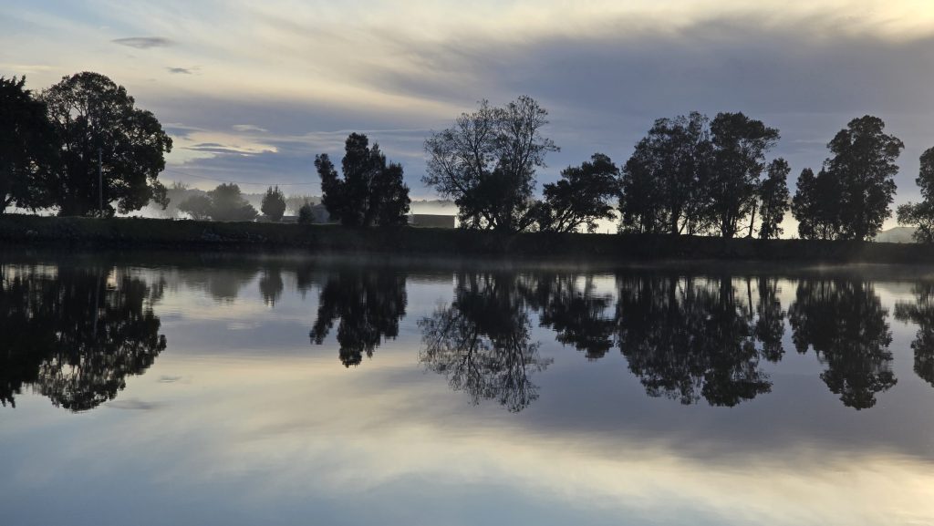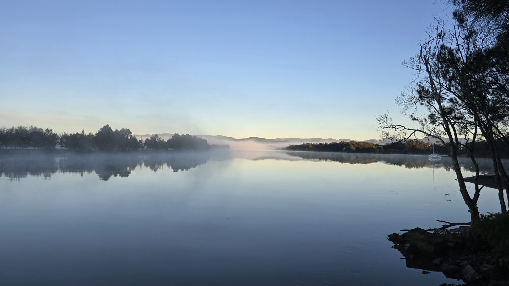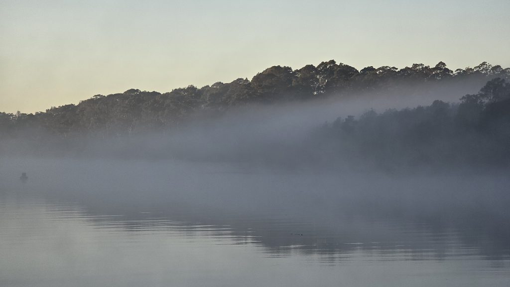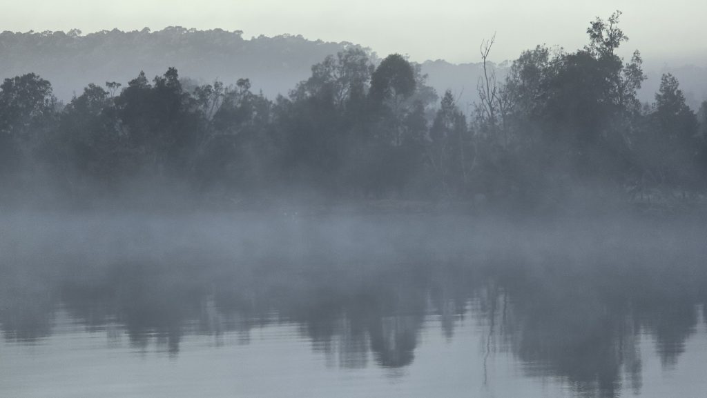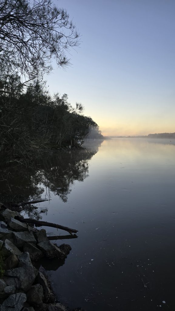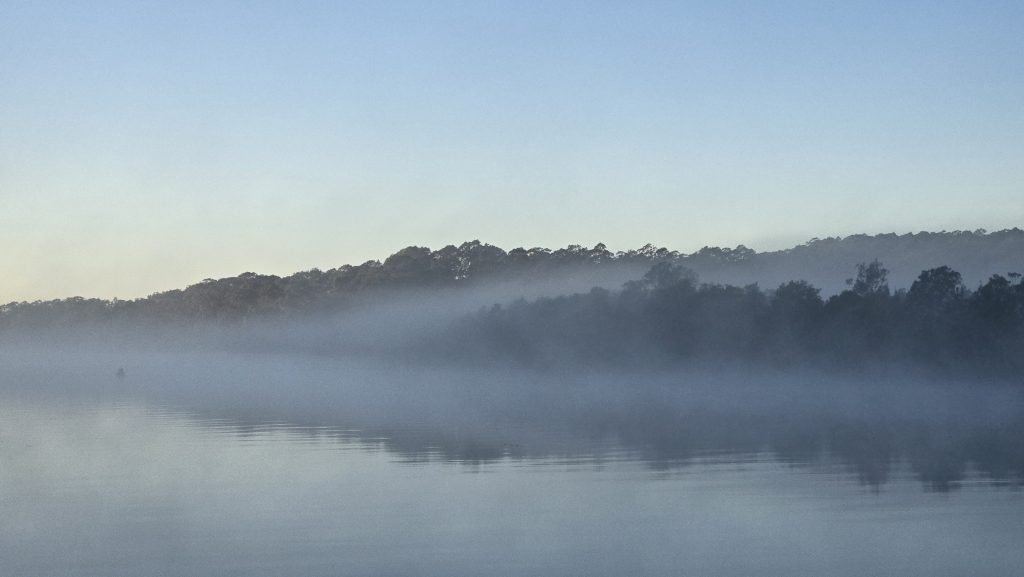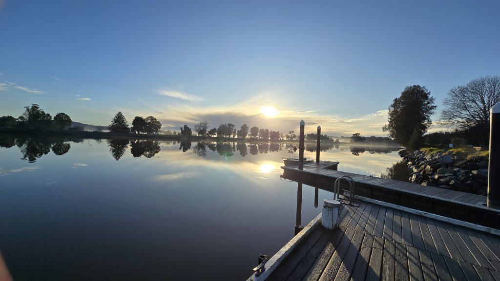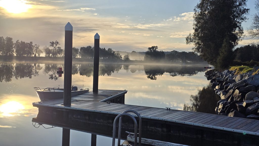 Earlier. A ritual has developed. Rip into a coffee in the dark, very early (around 4AM). An outright pleasure. While reading and commenting at The New York Times. With darkness barely nudged aside so I can see sufficiently to walk around the car and not hit it, pack up. Warming the engine all the while. Drive to Moruya. And get blown away along the valley flat, and then again at the river: