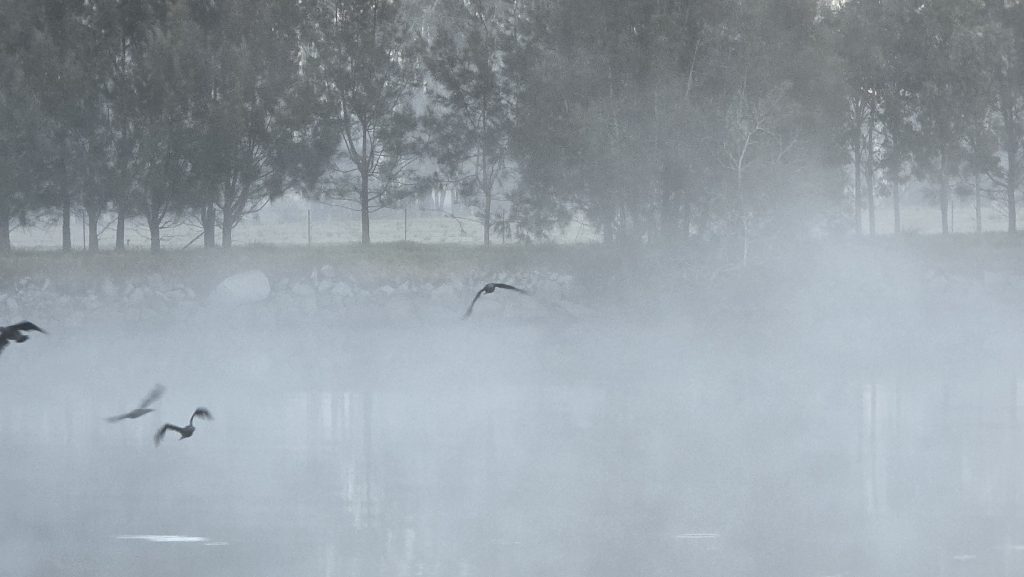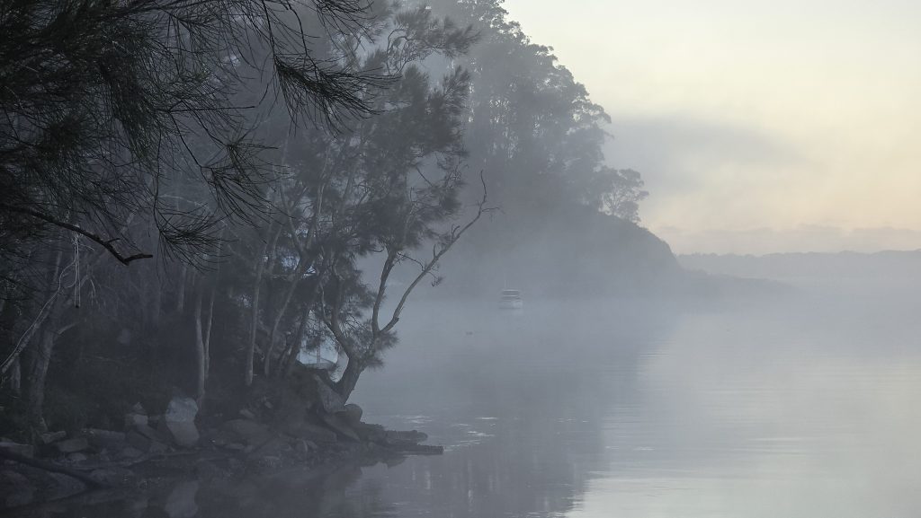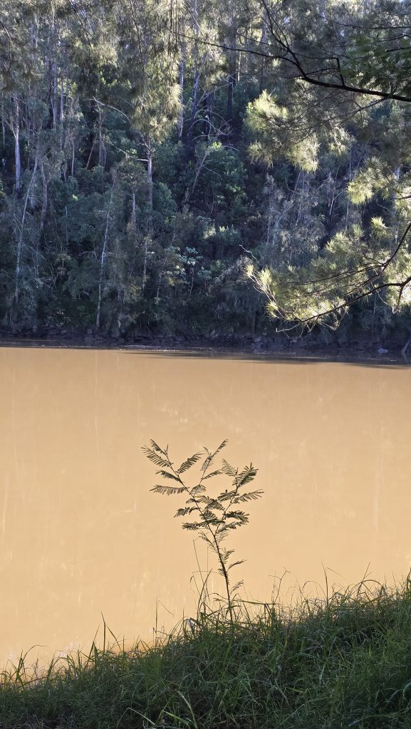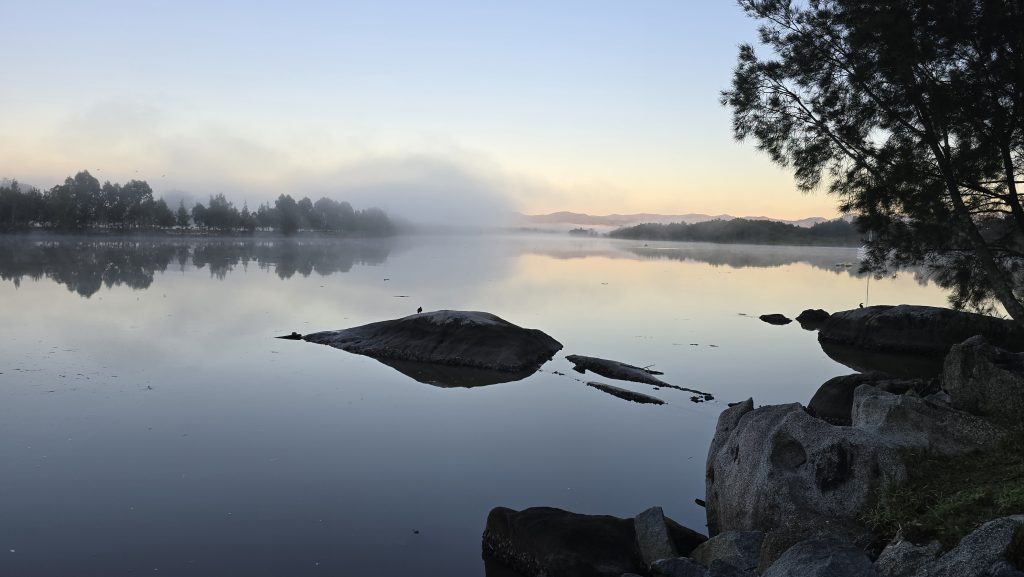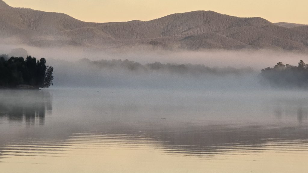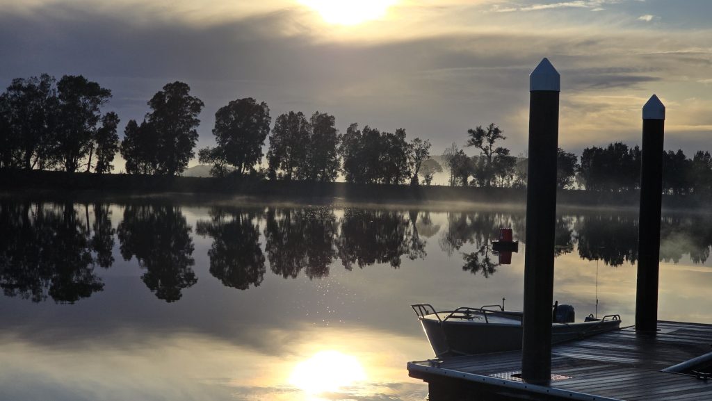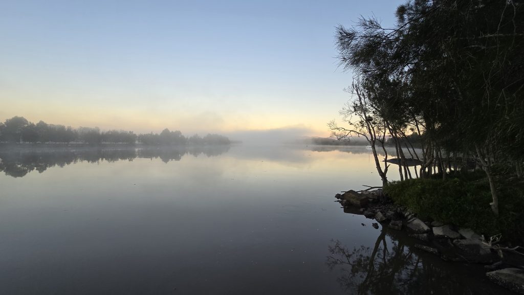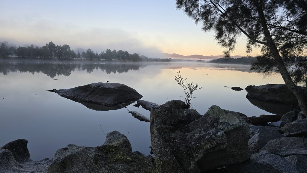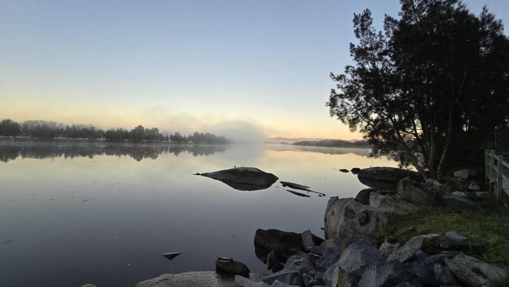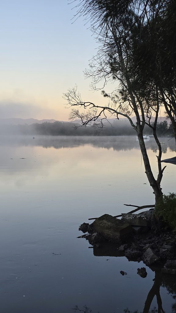 Earlier. A ritual has developed. Rip into a coffee in the dark, very early (around 4AM). An outright pleasure. While reading and commenting at The New York Times. With darkness barely nudged aside so I can see sufficiently to walk around the car and not hit it, pack up. Warming the engine all the while. Drive to Moruya. And get blown away along the valley flat, and then again at the river: