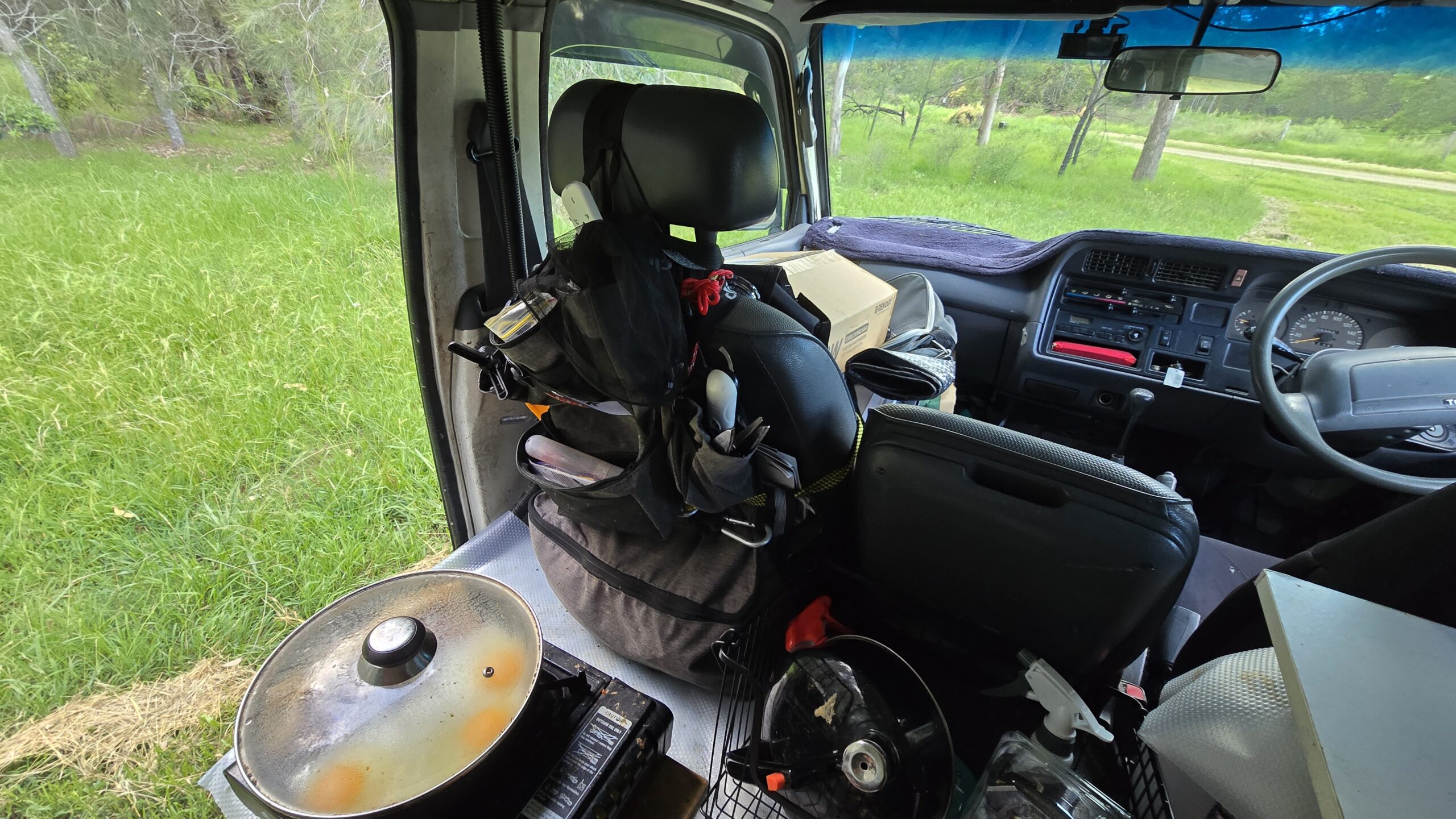 MHs eggs from yesterday, bacon, inverter in its box in the front, beside the river in one of the shower spots, and quite cold and very overcast morning in Moruya.
